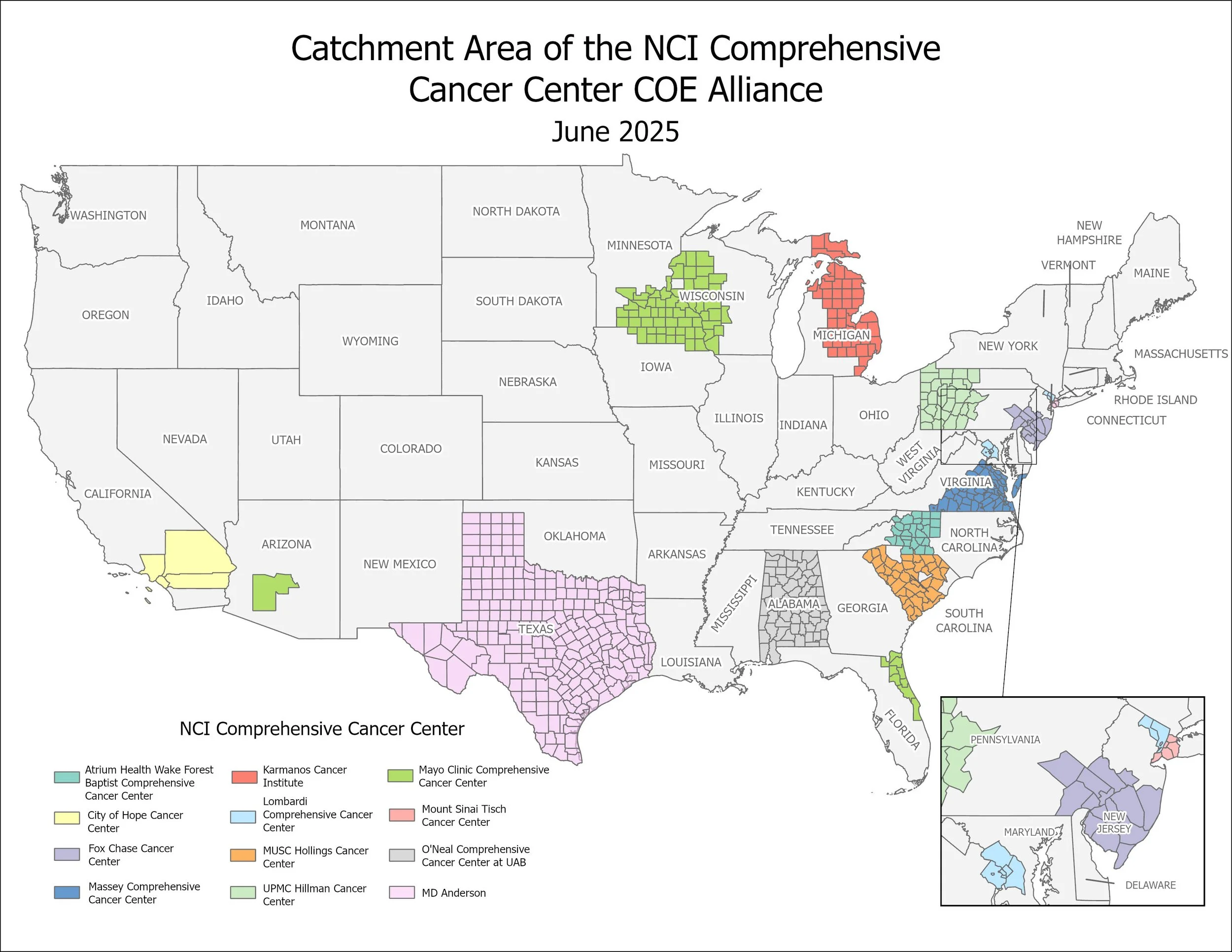 The Catchment Area served by Alliance members covers 16 states and territories. Every population group is included in this combined catchment area map and is served by an Alliance members’ Comprehensive Cancer Center.